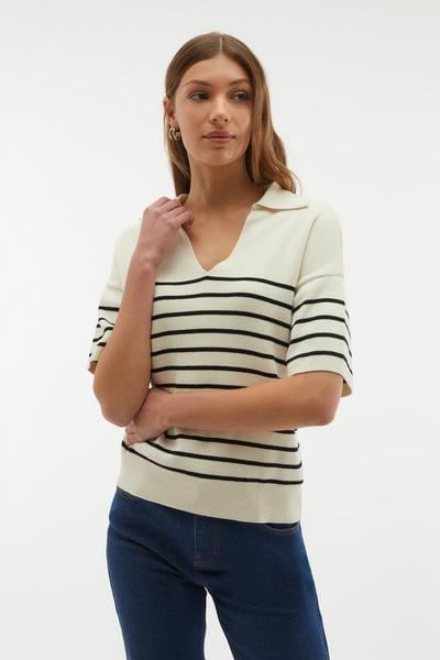 > > Mudo Bej Çizgili Polo Yaka Kisa Kollu Triko Kazak